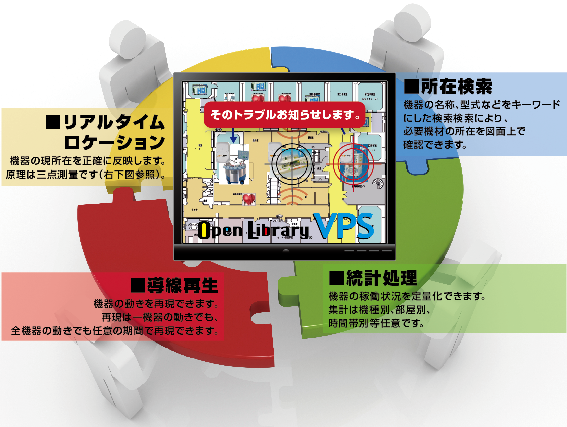 Open Library VPSと医療機器管理システム「Open Library ME」は連携し、機器の位置情報、運転情報を元に、機器の所在管理・稼動管理に利用されます。